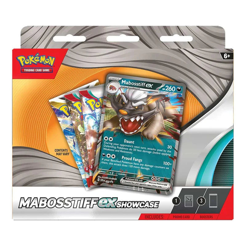 ¡Mabosstiff suele ser amable, pero puede parecer intimidante mientras protege a sus aliados! Une fuerzas con este Pokémon leal y asesta un golpe desalentador a tus oponentes. Encontrarás a Mabosstiff ex aquí como una tarjeta promocional foil, junto con tres paquetes de mejora de JCC Pokémon. El Showcase de Mabosstiff ex de JCC Pokémon incluye: 1 tarjeta promocional de aluminio con Mabosstiff ex 3 paquetes de mejora de JCC Pokémon Una tarjeta de código para Pokémon TCG Live